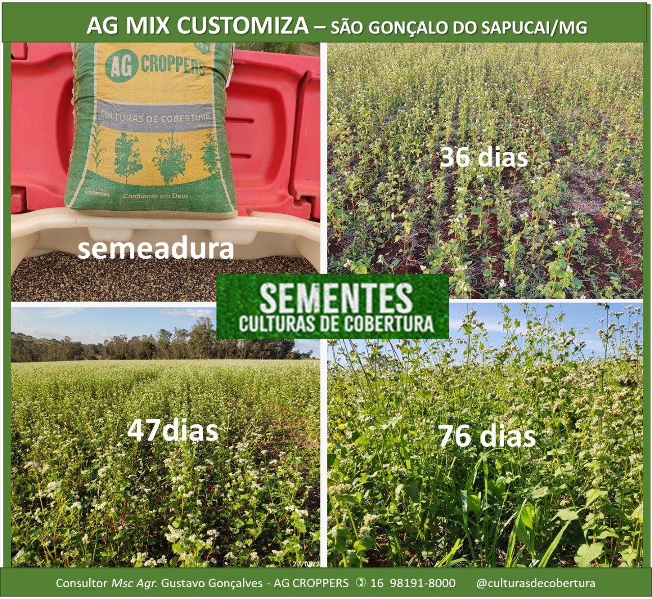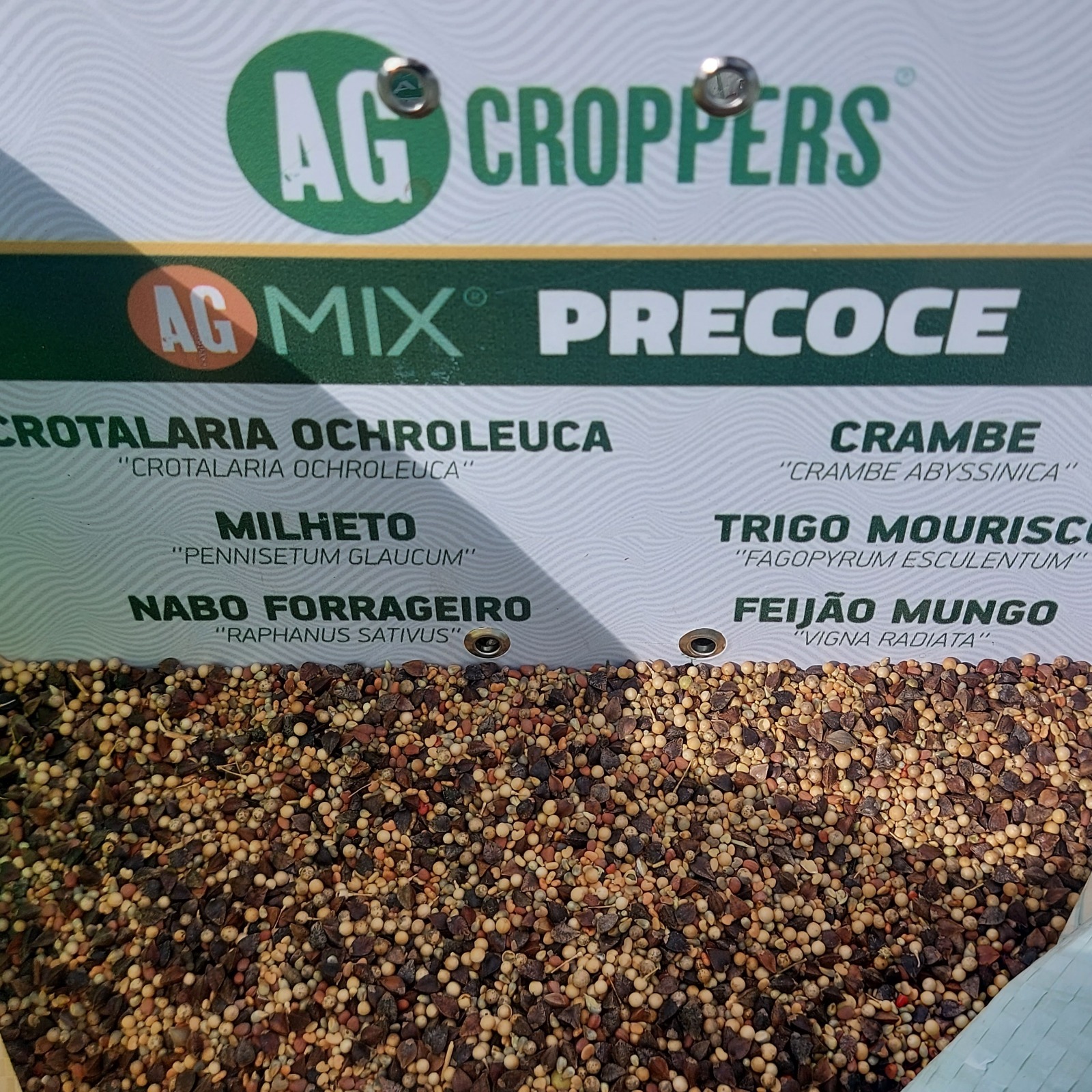 Composição do MIX SOLO VIVO PRECOCE: são uma mistura de sementes multi espécies, utilizada na rotação de culturas nos pivôs centrais, sendo mix customizado com crambe, trigo mourisco, nabo forrageiro, milheto entre outras opções. Semeadura pivô central de junho a agosto.